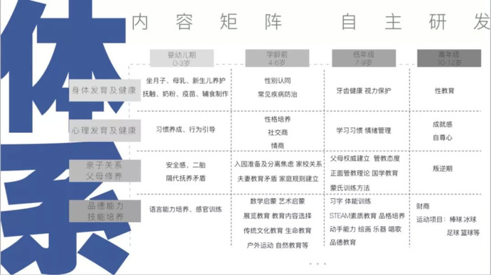 知名央视少儿主持人周洲于2016年10月创立的北京有养成长传媒凭借内容抢占亲职教育赛道,一年三获融资并从以网络综艺节目、短视频IP、直播PGC为核心形态的垂直内容供应商升级为以自有内容领跑、MCN模式驱动的父母教育入口级平台,通过知识付费课程、线下活动、智能硬件售卖、小程序布局打通线上线下场景,丰富用户需求闭环,B端C端双重发力,试图构建亲职教育内容全产业链生态体系。