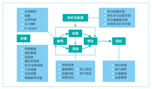 在高校数字化教育转型中,从教学目标、教学主体、教学环境、教育全流程等教学活动相关各要素以及全流程都将发生革新(如下图)。教学活动,由限定在特定实体空间的面授活动拓展为虚实融合空间中的多元化活动方式。在全息教学空间中,多样的数字技术工具与虚实融合的数字教学空间相结合,在教学活动进展过程中为学生提供了更丰富和及时的认知与情感支持。