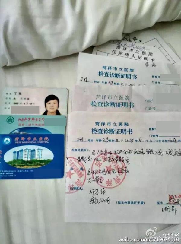 丁珍提供的病历显示,她在2014年8月被确诊患有急性淋巴细胞白血病。据大众网报道,2015年初,丁珍转到了菏泽市立医院治疗,该院血液科杨护士长告诉记者,丁珍在该院住过一段时间,由于钱不够,又出院了。