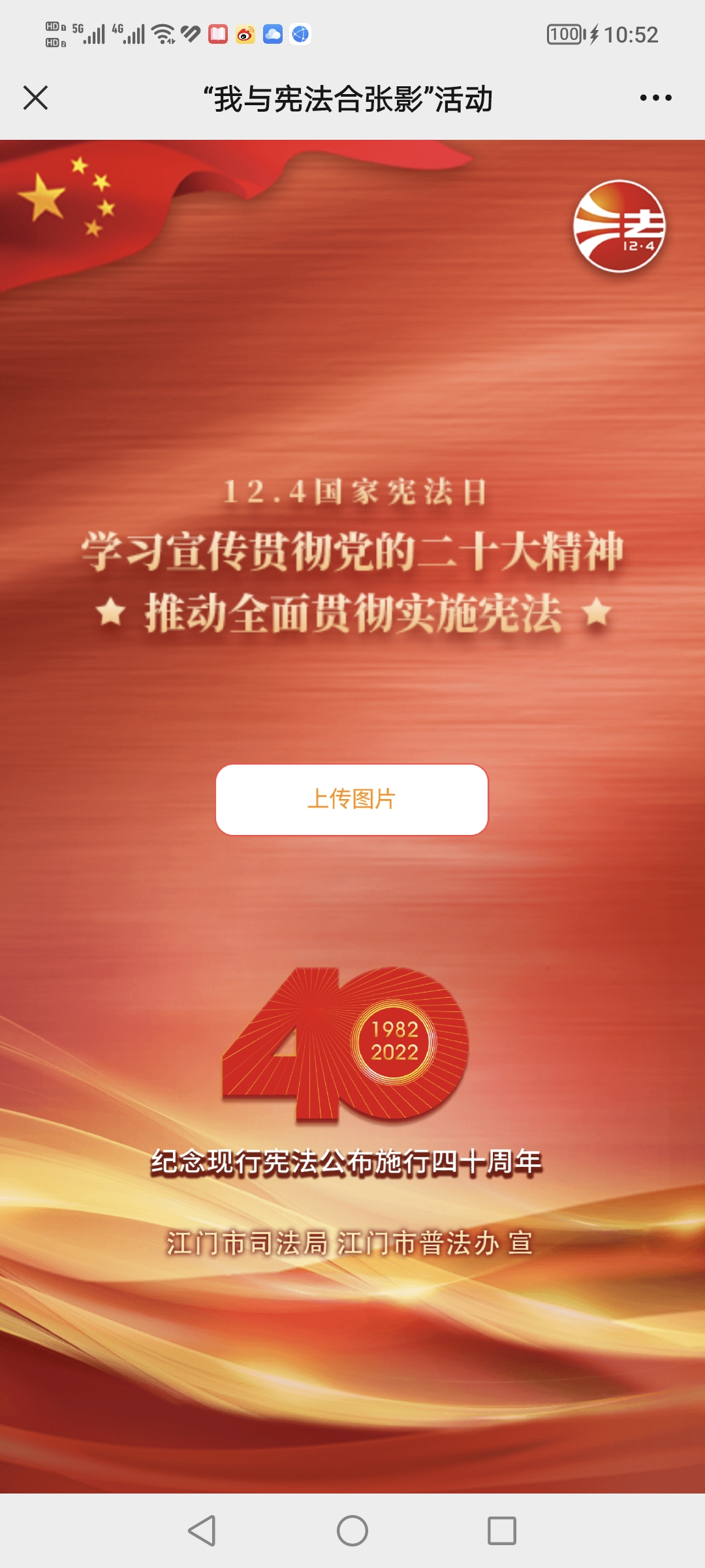 江门市普法办利用微信小程序,设计开发了H5“我与宪法合张影”活动。活动设计页面既有今年的宪法宣传周主题,也有现行宪法公布施行40周年的宣传标语,市民群众只需要上传一张自己的照片,就能自动生成一张漂亮的照片,让自己亲自参与到宪法宣传中。想要留下自己照片的你,可以扫描下面的二维码参加活动。