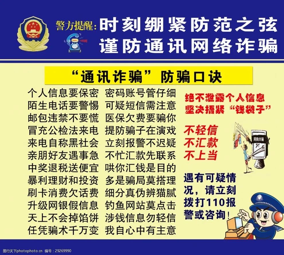 2.不透露。巩固自己的心理防线,不要因贪小利而受不法分子或违法短信的诱惑。无论什么情况,都不向对方透露自己及家人的身份信息、存款、银行卡等情况。如有疑问,可拨打110求助咨询,或向亲戚、朋友、同事核实。