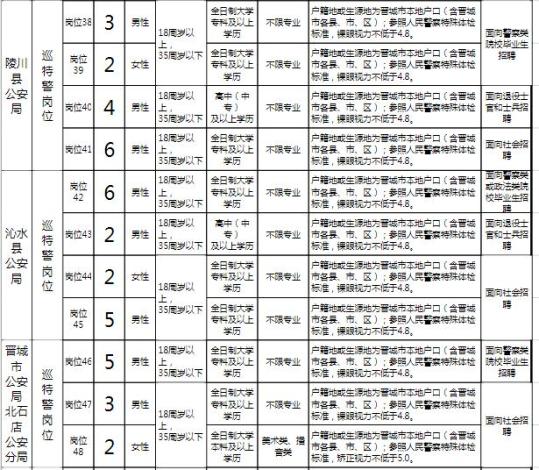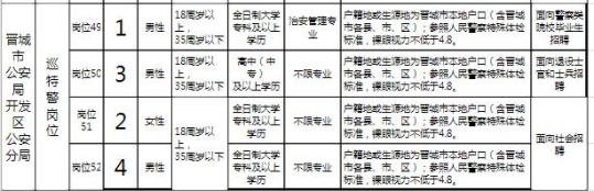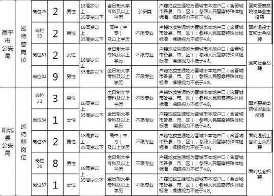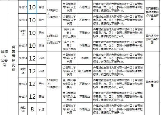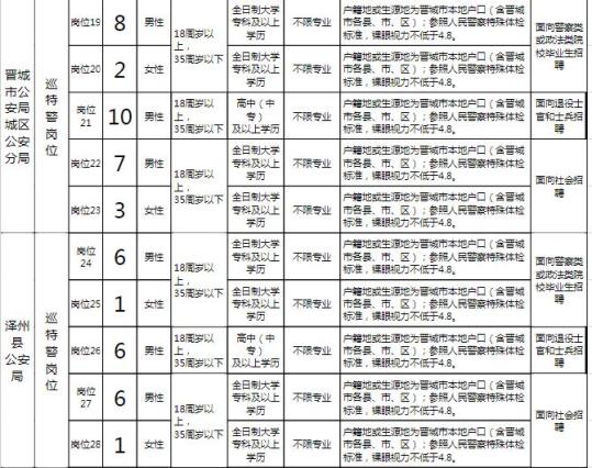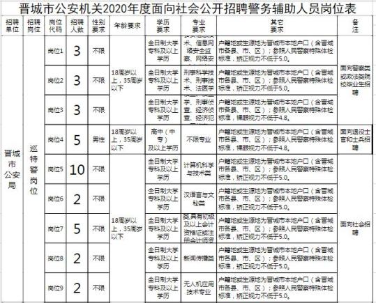 晋城市公安机关共公开招聘261名警务辅助人员(巡特警岗位165名,留置看护岗位96名),其中,69名从警察类或政法类院校毕业生中招聘,54名从退役士官和士兵(男性)中招聘,138名面向社会招聘,具体招聘岗位、人数、资格等条件详见《晋城市公安机关2020年度面向社会公开招聘警务辅助人员岗位表》。
