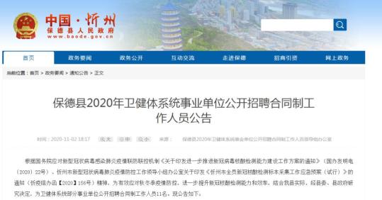 根据国务院应对新型冠状病毒感染肺炎疫情联防联控机制《关于印发进一步推进新冠病毒核酸检测能力建设工作方案的通知》(国办发明电〔2020〕22号)、忻州市新型冠状病毒肺炎疫情防控工作领导小组办公室关于印发《忻州市全员新冠核酸检测标本采集工作应急预案(试行)》的通知(忻疫组办函【2020】156号)精神,为有效应对秋冬季疫情防控,进一步提升新冠核酸检测能力和效率,结合我县实际,经县委、县政府研究决定,为卫健体系统部分事业单位公开招聘合同制工作人员11名。现公告如下:
