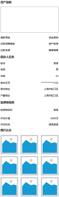 用户点击标的,可以进入到标的详情,具体如下,主要要包含标的的期限/起投金额/年化利率等等参数,根据合规要求,还要包含借贷项目详情/出借记录/资产说明/还款计划等等数据。