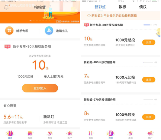 下面以拍拍贷理财端和宜人贷借款端为例说明市场上的平台及其业务;类似于登录/注册/活动等等类似功能和页面分布以及UI交互不赘述。