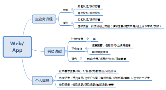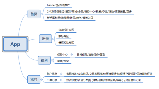 下面主要从理财端和借款端作简单分析,两端分开有以下部分原因:一是目前银行存管中的出借人/借款人身份不可兼得;二是理财和借款业务流程不同。即便是一个app包含两种身份登陆及产品使用流程,但严格来讲还是属于两个不同产品。