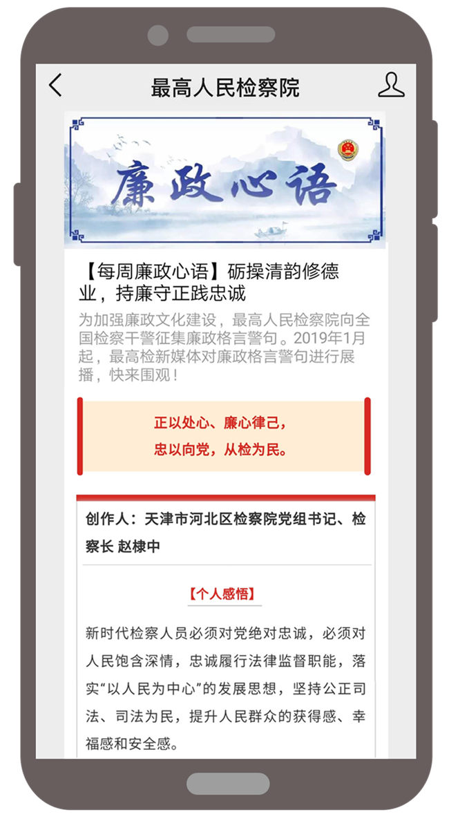 最高检新媒体把每一条廉政格言警句都制作成精美的海报,每天刊发在官方微博上。最高检官方微信把每天的廉政格言警句集纳在一起,每周日单条重磅推出。