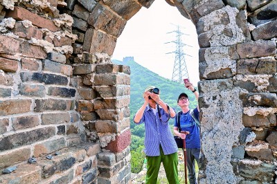北京延庆的长城花家窑子段,年近八旬的退休美术编辑严欣强(左)在拍摄长城的形态构成。1984年起,严欣强和儿子一同自费考察、拍摄、记录各地不同年代、不同类型的长城,汇编成一本《长城形态图志》,并于2023年出版。新华社发