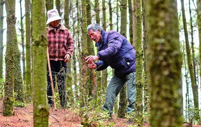 云南陆良县,66岁的护林员王石贵与妻子一起在山林间查看树木生长情况。新华社发