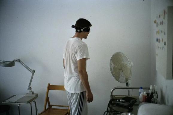 为强调某种具有荒诞性的规则,兰斯莫斯选择事件发生的地点普遍是房间内、围墙内、封闭空间内。该空间与开阔的风景不相关,并且总是纯白色的墙壁。人物在该空间内总是会感到一种局促或空洞。封闭的房间和规则形成对照,处于规则中的人们也因此被空间所禁锢,从而在视觉上强调被规则支配的生活。
