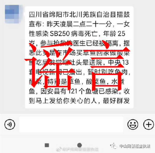 谣言分析:经常上网的小伙伴应该对此条谣言相当熟悉了。除此之外还有把病毒名改成“sk520”、“sk5”、“sk6”、“sb5”等等,把鱼肉改成羊肉、鸡肉等版本。若仔细看,也能感觉哪里不对,SB?250?