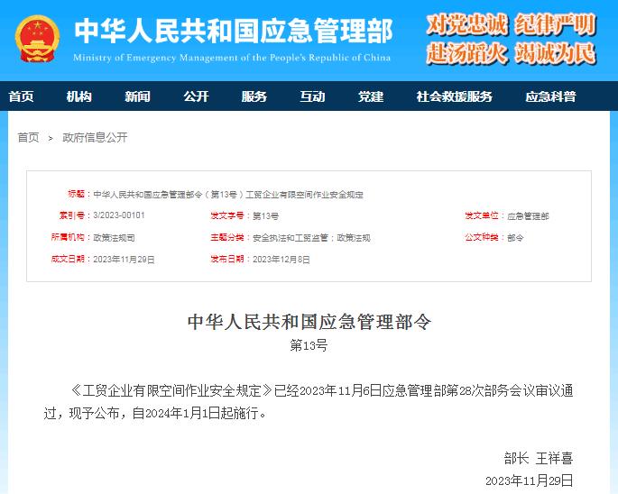《工贸企业有限空间作业安全规定》已经2023年11月6日应急管理部第28次部务会议审议通过,现予公布,自2024年1月1日起施行。