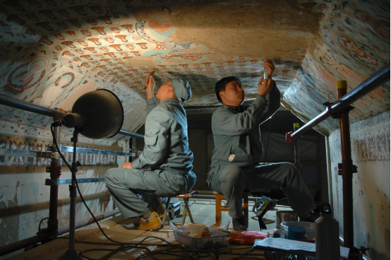 敦煌研究院与国内外的高等院校、科研院所持续多年开展合作,共同对莫高窟的保护、传承和管理进行了探索研究,吸收了国内外的先进保护理念和成功管理经验,学习了先进的保护方法和工艺,使古代壁画保护在国内居于领先地位,并逐渐与国际接轨。敦煌研究院还采用多种办法,培养不同层次人才,充分借助国内外合作的有利条件,选送中青年专业人员到国内外高等院校、科研院所进修学习。现已建成一支多学科的专业人才队伍,为莫高窟的保护传承事业提供了坚实的人才支撑。
