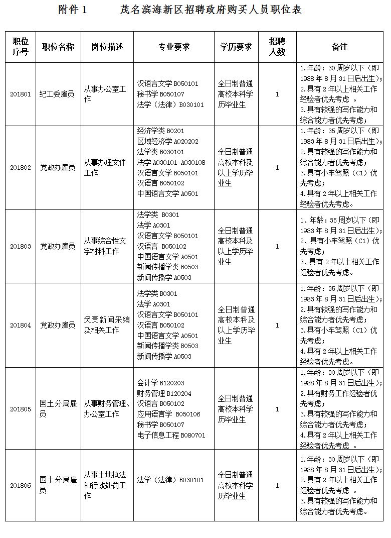 为加强滨海新区人才队伍建设,现面向社会公开招聘政府购买人员6名。聘用人员将以茂名滨海新城综合服务有限公司(该公司是茂名滨海新区属下的国有企业子公司)员工身份派遣到茂名滨海新区管理委员会从事机关公务工作。