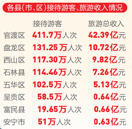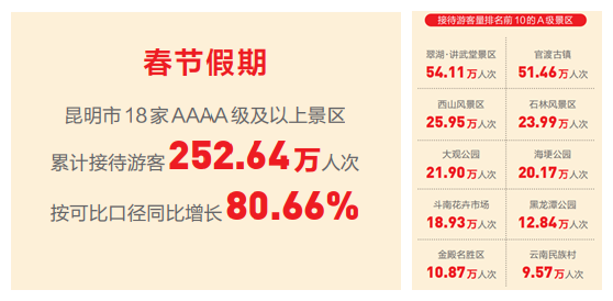 今年春节假期,昆明市凭借一系列丰富多彩的文化活动和贴心周到的服务保障,强劲圈粉,打造了一场“热辣滚烫”的文旅盛宴。数据显示,春节假期,昆明市共接待国内游客1368.41万人次,按可比口径同比增长32.93%;38个A级景区共接待游客342.66万人次,按可比口径同比增长79.73%。