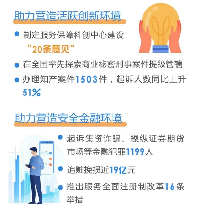 2023年,上海市检察机关聚焦“以检察工作现代化服务中国式现代化”中心任务,以能动履职促进发展、维护稳定、保障善治,起诉制售伪劣产品、串通投标、走私等破坏市场经济秩序犯罪5193人,以公正司法保障公平竞争;依法办理涉案金额2.8亿元的侵犯国内顶尖企业芯片商业秘密、“商业间谍”向境外咨询企业“供料”等1503件知产案件,服务科技自立自强;起诉集资诈骗、操纵证券期货市场等金融犯罪1199人,追赃挽损近19亿元;依法办理利用虚拟币洗钱、全国首例期货居间人非法经营咨询业务等新型案件,推出服务全面注册制改革16条举措,推动加强涉期货和衍生品违法犯罪监管,联合开展网上非法证券活动、不法贷款中介等专项治理,相关经验在全国推广,共同守住不发生系统性风险底线。