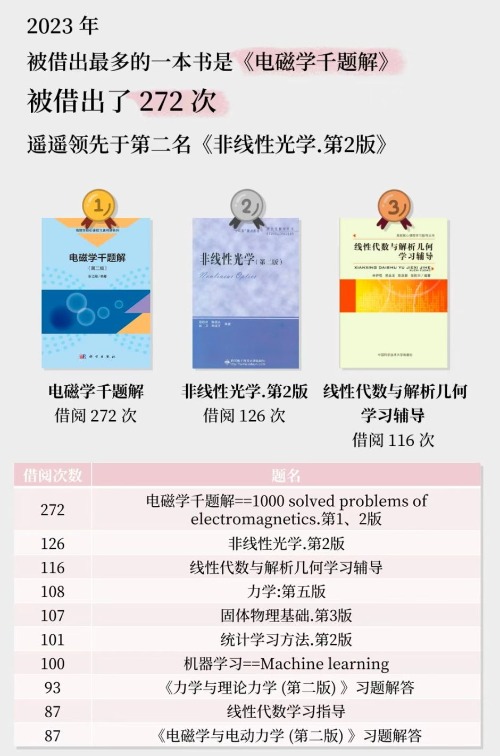 大皖新闻讯 近日,中国科学技术大学、同济大学、西北工业大学、北京科技大学、湖北大学等多所高校公布了2023年度图书馆全年数据。数据显示,2023年中国科学技术大学图书馆一共借出137917册图书,其中被借出最多的一本书是《电磁学千题解》,被借出272次;西北工业大学的仝希同学是2023年借阅图书最多的人,高达876册次;湖北大学的成同学2023年在图书馆学习时长近4000小时……