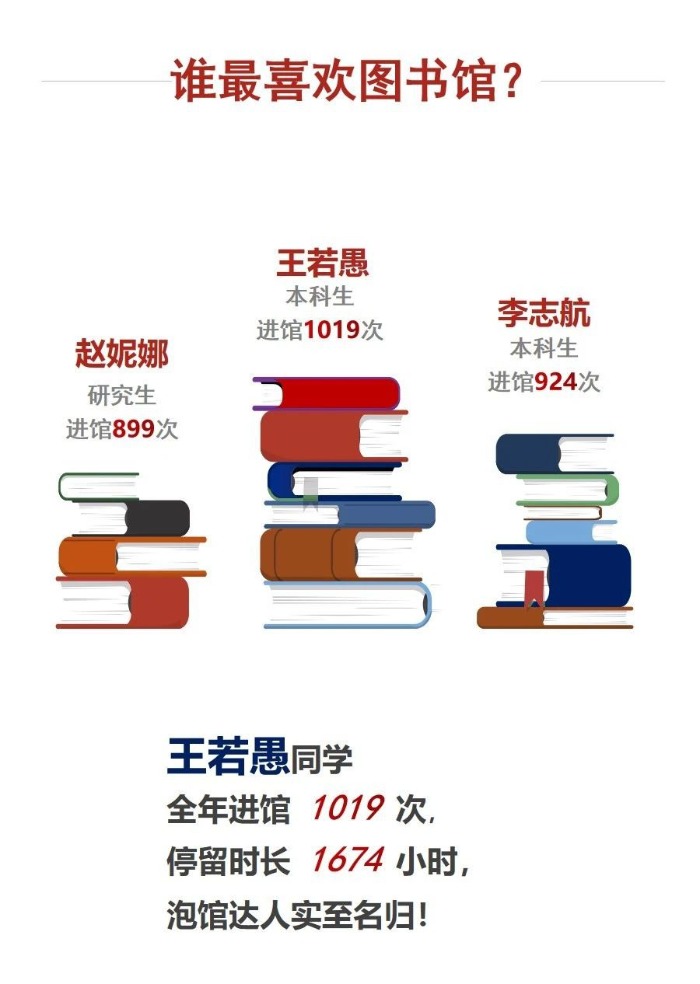 湖北大学外国语学院的赵同学全年预约入馆931次,是该校全年进出图书馆最多的读者。在学习时长方面,前十名都是该校2020级备战考研的同学,其中微电子学院的成同学在馆学习时长总计3971小时,平均每天在馆学习12小时,真正可谓“以馆为家”。计算机学院的本科生王若愚是西北工业大学最喜欢去图书馆的人,王同学全年进馆1019次,停留时长1674小时,是实至名归的泡馆达人。王同学表示图书馆良好的环境和氛围使得其成为最适合师生学习的地方,浩如烟海的藏书有益于全校学生在业余时间拓展眼界。