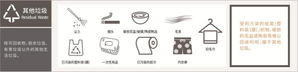 其他垃圾:指除有害垃圾、可回收物、厨余垃圾以外的其他生活废弃物,大多数家用卫生品以及复合型的。由多种材质、部件组成却难以拆解的产品,比如打火机、笔、伞等。