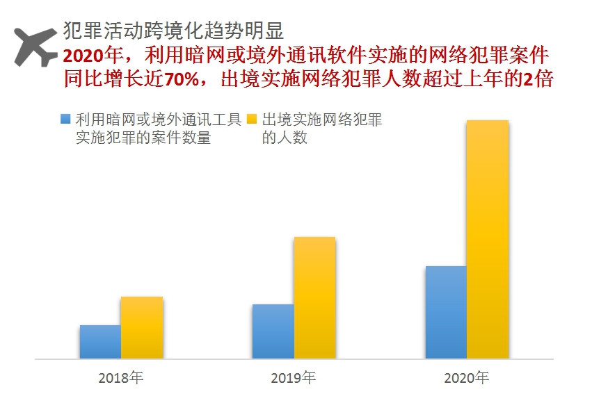 五是集团化、跨境化特征凸显。网络犯罪逐渐告别“单兵作战”模式,依附于网络黑灰产业,更多以团伙或集团形式作案。参加犯罪团伙甚至更大规模犯罪集团的网络犯罪嫌疑人,占犯罪总人数的83%。有的犯罪分子为逃避监管打击,将犯罪窝点、通讯工具等向境外转移,有目的性地针对我国公民实施跨境网络犯罪,网络犯罪中跨境实施的占13%。暗网和境外通讯软件在网络犯罪中的应用明显增多,2020年检察机关办理利用暗网或境外通讯软件实施的网络犯罪案件同比增长近70%,出境实施网络犯罪的人数超过上一年的2倍。