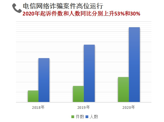 来自最高检统计数据显示,2020年,全国检察机关起诉涉嫌网络犯罪(含利用网络和利用电信实施的犯罪及其上下游关联犯罪)14.2万人,同比上升47.9%。当前,传统犯罪加速向网络空间蔓延,特别是利用网络实施的诈骗和赌博犯罪持续高发,2020年已占网络犯罪总数的64.4%。随机诈骗与精准诈骗相互交织,冒充公检法人员诈骗、交友诈骗、退款诈骗、信用卡贷款提额诈骗、刷单诈骗等较为突出。为赌博网站“洗白”资金的“跑分平台”、非法收集公民个人信息的“流氓软件”、扰乱网络市场秩序的“恶意刷单”等案件层出不穷。