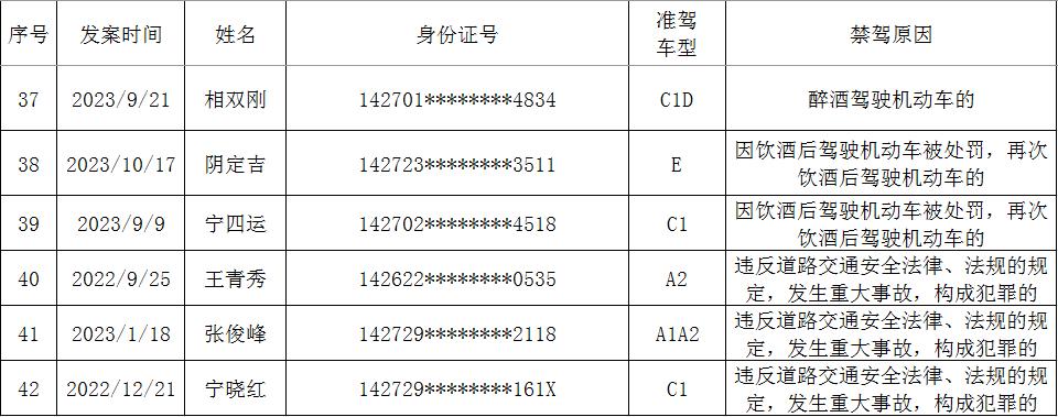 2024年,为有效惩治严重交通违法行为,大力维护良好的道路交通秩序,确保人民群众出行安全,运城交警不断加大对各类严重交通违法行为的查处和打击力度,依法对醉驾、驾驶报废车、拼装车、涉嫌交通肇事罪等严重交通违法行为的当事人做出吊销机动车驾驶证或者终身禁驾的处罚,被吊销机动车驾驶证的42人进行曝光,希望广大驾驶人引以为戒,牢记安全,守法驾驶。