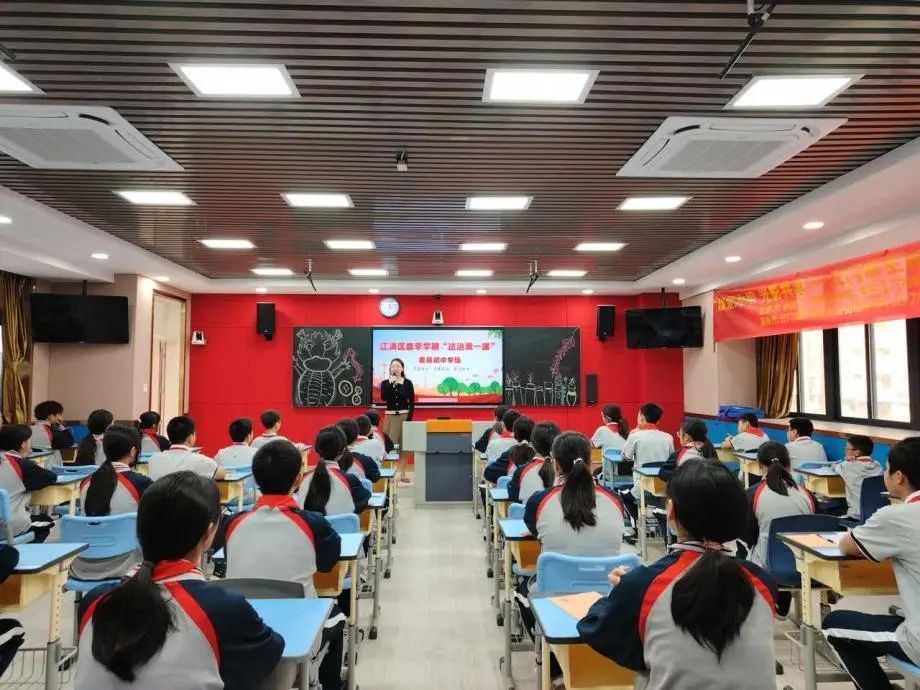 江海区司法局办公室一级科员、江海区景贤初中法治副校长刘芳菲以商鞅”徙木立信“的故事说明法的重要性,并引导同学们从热门电影《第二十条》中学习法律知识,正确识别校园欺凌的类型,抵制校园欺凌,学会如何应对校园欺凌。