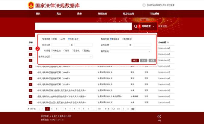 用户还可以通过高级搜索来进行更加精确的查询。点击高级搜索,下方出现弹框:可以通过勾选弹框中的选项来进行精确的筛选(施行日期、公布日期、时效性、制定机关、法律效力位阶)