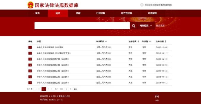 点击“首页”,在“宪法、法律、行政法规、地方性法规、司法解释”中任意一个“更多”按钮,可以跳转到对应栏目,并展示相应详细数据列表。(以宪法为例)