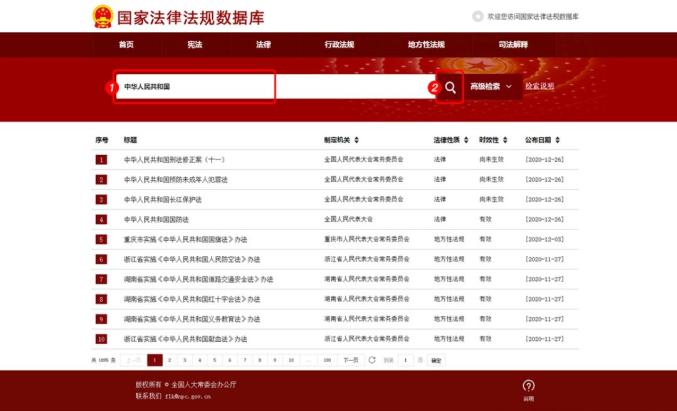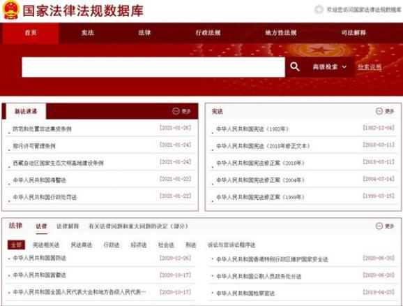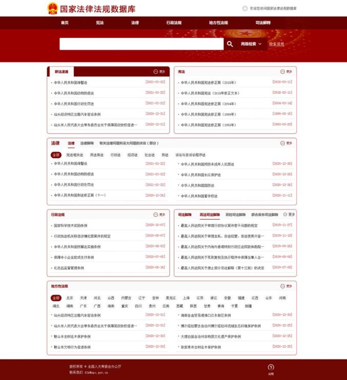 2021 年 2 月 24 日,国家法律法规数据库开通上线,免费向社会公众提供法律检索查询服务。该数据库刊载了中华人民共和国现行有效的宪法(含修正案)、法律、行政法规、地方性法规、自治条例和单行条例、经济特区法规、司法解释的电子文本。国家法律法规数据库由全国人大常委会办公厅维护。