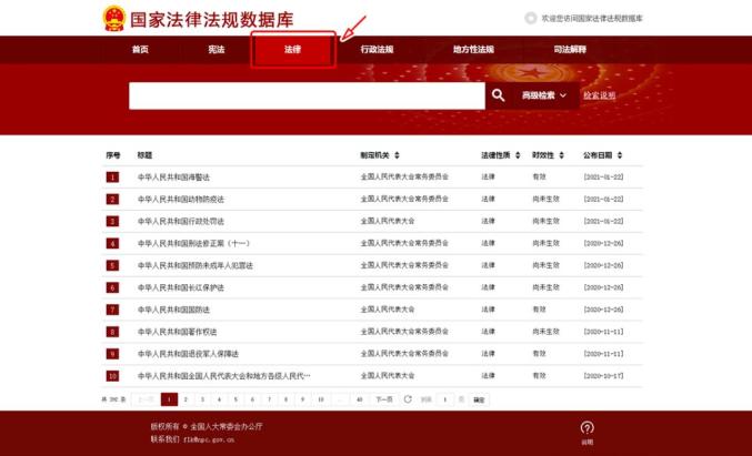 点击不同法律种类的按钮(以法律为例),可以查询相应的法律法规,相应的法律法规则会通过列表的形式展示,序号、标题、制定机关、法律性质、时效性以及公布日期。