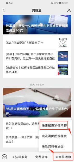 关注“闵晓法”微信公众号,在手机下方子菜单“当前活动”中找到“法律知识秒懂问答”进入答题页面即可答题。