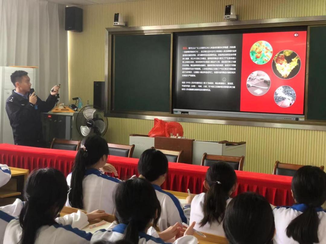 首先,民警向同学们讲解新型毒品的种类、危害及禁毒相关法律法规,科普毒品防范知识,引导同学们要时刻保持高度警惕,提高防范意识,谨慎交友,不进入治安复杂场所。并倡导大家将禁毒知识分享给家人和朋友,为创建“无毒校园”贡献力量。