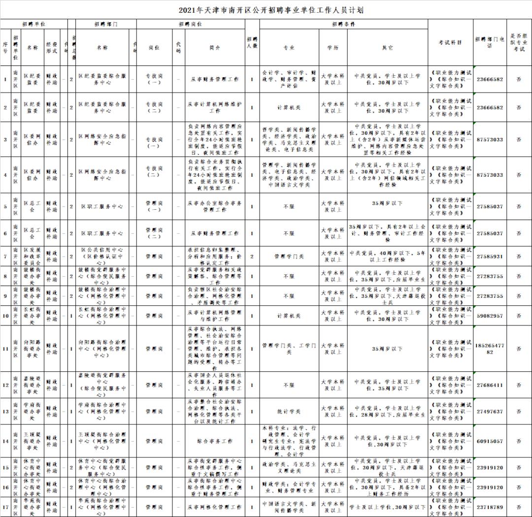 详见《2021年天津市南开区公开招聘事业单位工作人员计划》。
