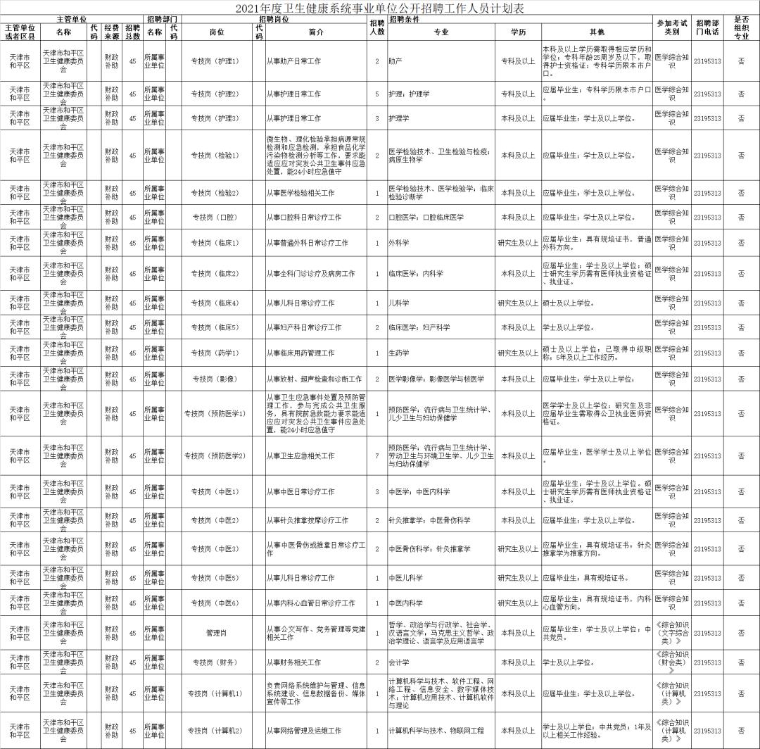 为加强卫健人才队伍建设,满足和平区卫生健康系统事业发展需求,按照国家和天津市关于事业单位公开招聘工作有关规定,和平区拟面向社会公开招聘工作人员45名。受聘人员纳入事业编制,工资福利及待遇按照国家、市、区规定的同等人员标准执行。