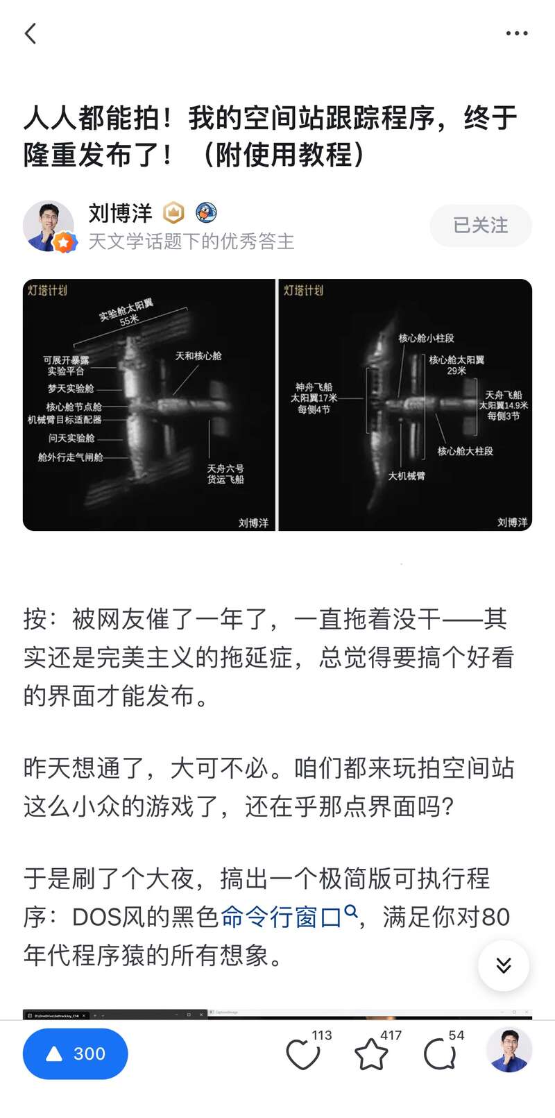 2022年,刘博洋曾利用自主开发的光学跟踪程序,拍摄了中国空间站的特写影像。广大天文爱好者在知乎与刘博洋交流或请教,刘博洋在知乎发布的科普回答、想法、视频等内容,获得近34万次赞同。