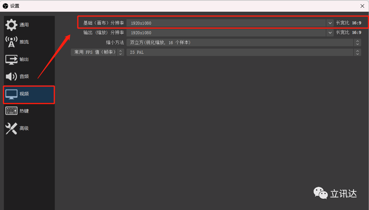 第一步:打开OBS设置 - 视频,找到基础分辨率(如下图);