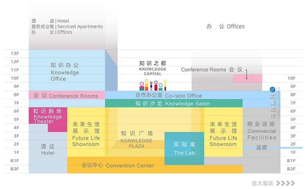 《发挥北梅田所具备的巨大潜力,以最尖端最有潜力的知识(人才、信息、技术和知识)为资源,围绕对未来生活的提案、体验和学习这一主题,通过人、物和信息界面,努力成为能够创造全新知识的「创造未来生活的信息收发据点」。》