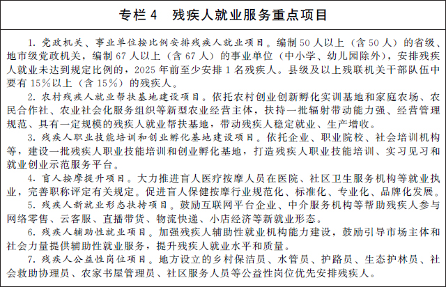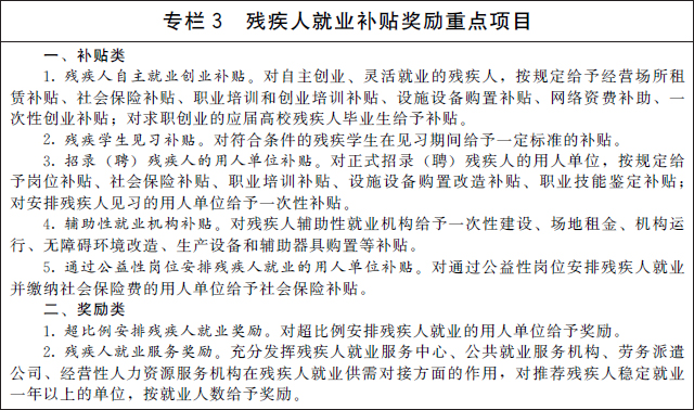 1.完善残疾人就业法规政策。修订实施《残疾人就业条例》。落实残疾人就业支持政策,保障残疾人就业培训、就业服务、补贴奖励等相关资金投入。完善残疾人按比例就业制度,制定党政机关、事业单位、国有企业带头安置残疾人就业办法,合理认定按比例安排残疾人就业形式。加强残疾人就业促进政策与社会保障政策的衔接,纳入低保范围的已就业残疾人可按规定在核算其家庭收入时扣减必要的就业成本,并在其家庭成员人均收入超过当地低保标准后给予一定时间的渐退期。按照国家有关规定,对残疾人就业先进个人和用人单位予以表彰。