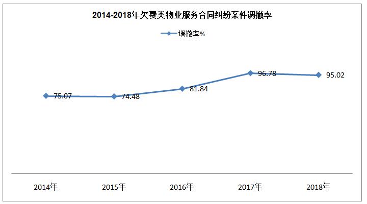 2014年至2018年欠费类的物业服务合同纠纷案件结案数依次为1,616件、1,462件、1,448件、746件、1,848件(见图3),调撤率较高,依次为75.07%、74.48%、81.84%、96.78%、95.02%(见图4),调撤率不断提升且均属高位。