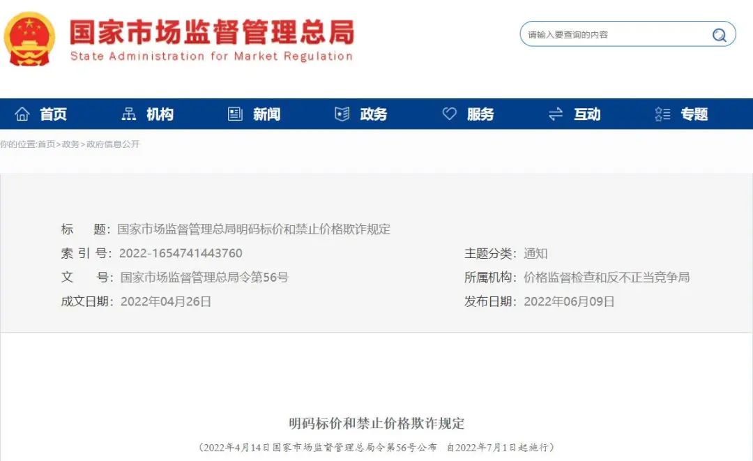 为规范经营者明码标价行为,预防和制止价格欺诈,维护市场价格秩序,保护消费者、经营者合法权益和社会公共利益,市场监管总局发布的《明码标价和禁止价格欺诈规定》7月1日起施行。