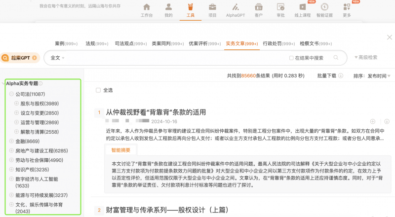目前,Alpha 数据库实务专题共计上线公司法,金融,房地产与建设工程,劳动与社会保障,知识产权,数字经济与人工智能,能源与可持续发展,文化、娱乐传媒与体育八大业务板块,并会持续更新,覆盖更多业务类型。其中,【公司法】专题分为股东与股权、设立与变更、运营与管理、解散与清算四大类和30个细分类别,涵盖超过46万条法规、82万篇案例、9500篇实务文章。而【金融】专题则分为15个细分类别,涵盖超过18万条法规、1200万篇案例、7500篇实务文章。