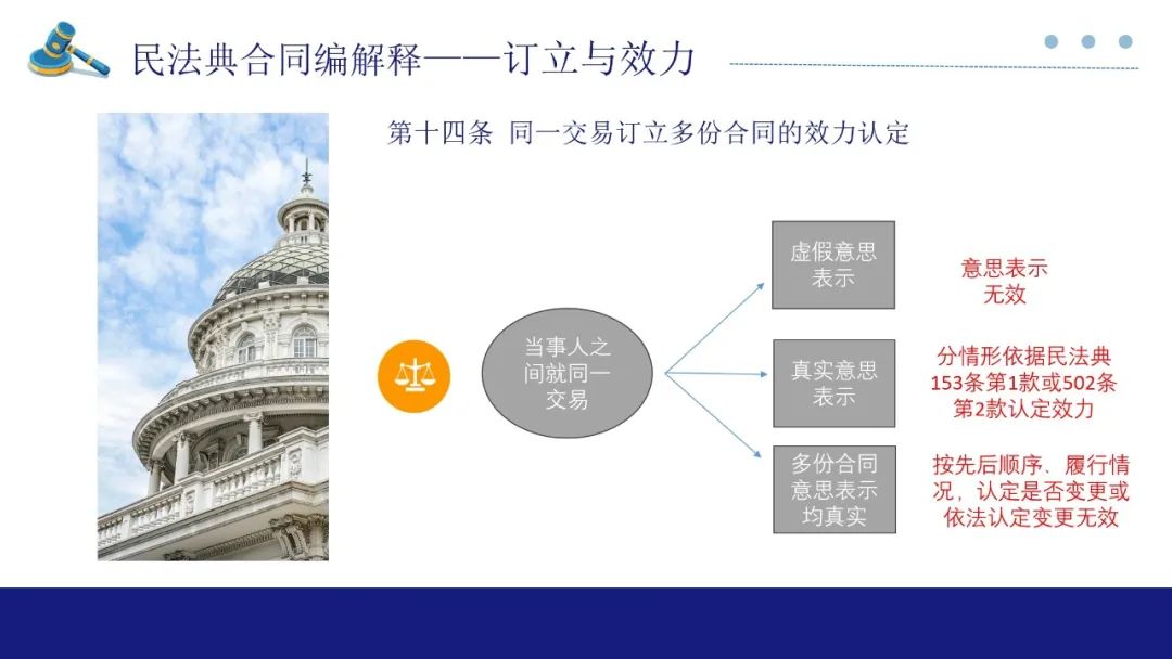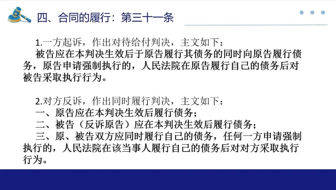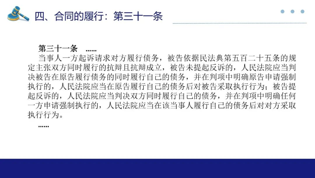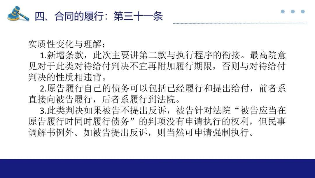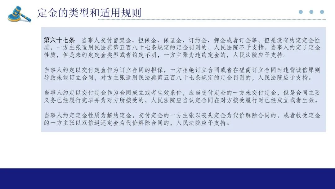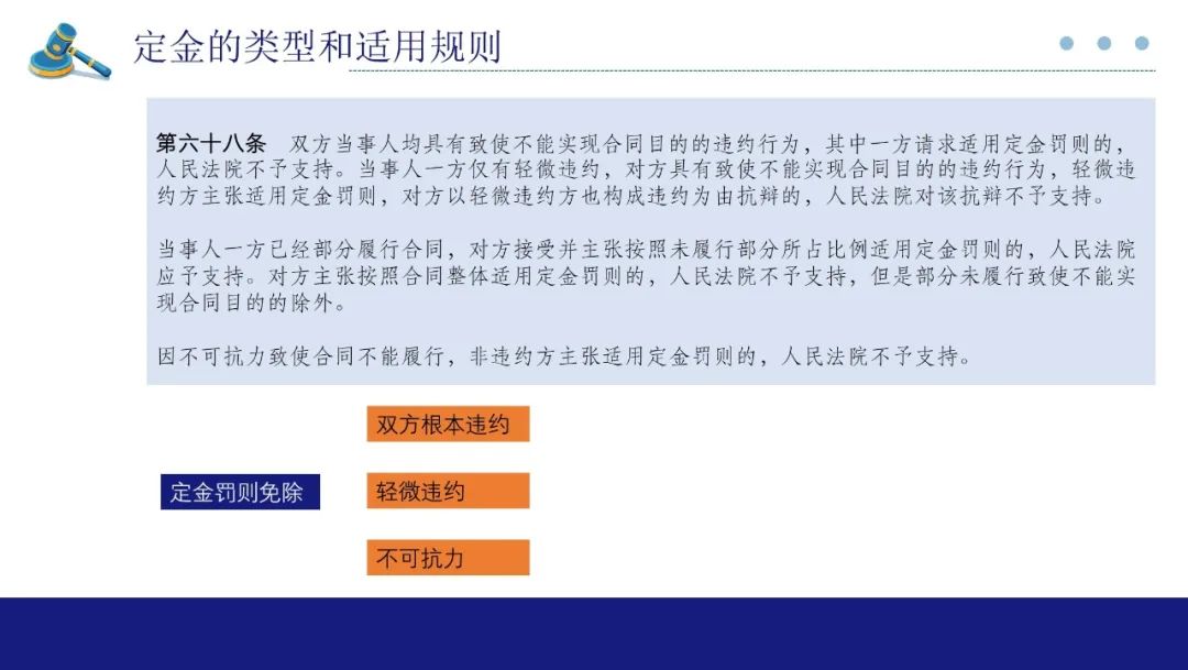 其次,对适用定金罚则规定了三个规则:1、当事人一方仅有轻微违约,对方具有致使不能实现合同目的的违约行为,重大违约一方不能以对方轻微违约为由对定金请求权进行抗辩;2、合同部分履行的情况下,定金罚则可以按照履行比例适用,但不完全履行导致不能实现合同目的情况下,还是要整体适用定金罚则;3、在不可抗力的情况下,不能适用定金罚则。