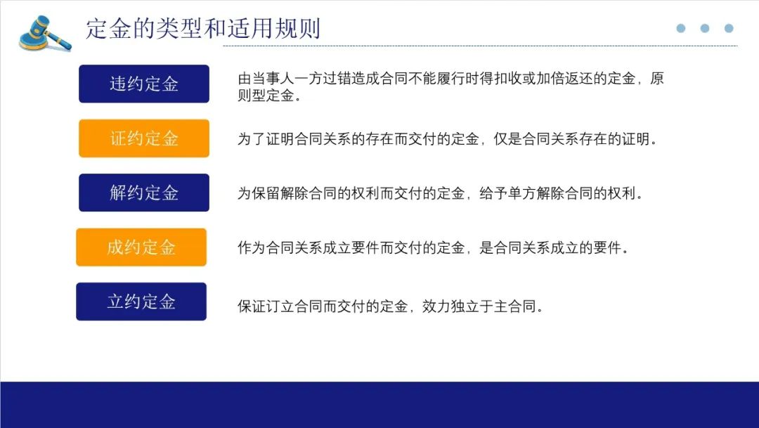 首先,合同没有明确预定定金性质的,无权适用民法典第587条规定的定金罚则,定金包括违约定金、立约定金、证约定金、解约定金,合同约定了定金性质,但未约定定金类型,可以按照当事人的主张确定为违约定金。定金类型中,需要注意如果约定了解约定金,实际上是约定了任意解除权,当事人可以丧失定金或双倍返还定金为代价解除合同。