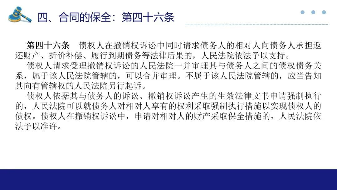 第46条为新增条款。第一款明确了债权人撤销权的行使后果出返还财产外,如遇财产不能返还或返还无益于债权实现的(如已经设立的足额抵押),可以要求相对人折价补偿、赔偿或履行债务。第二款明确了债权人撤销权的行使不以债权人对债务人的债权已生效或已由生效法律文书确认为前提。第三款明确了债权人撤销权的生效判决,虽然实体权利人是债务人,但债权人有权申请强制执行。还明确了诉讼中债权人可申请财产保全。从效果来看,本条规定相当于统一了代位权诉讼和撤销权诉讼的实质效果。