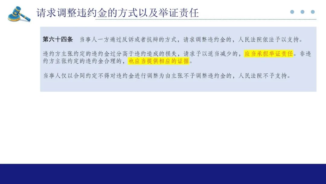 第64条是请求调整违约金的方式和举证责任。首先何种违约金可以进行调整。一般认为,应当是指在违约行为发生之前双方约定的违约金,若存在过低或过高问题,可以要求调整;若是在违约行为发生之后,双方商定的违约金应不得请求调整;若存在胁迫、欺诈可请求撤销,也不涉及到调整问题。其次关于举证责任,从该条文的文字表述来看,对于违约方明确表述为“应承担举证责任”,而对于守约方表述为“也应提供相应的证据”,因此违约方承担的是结果意义的举证责任,守约方承担的是行为意义的举证责任。