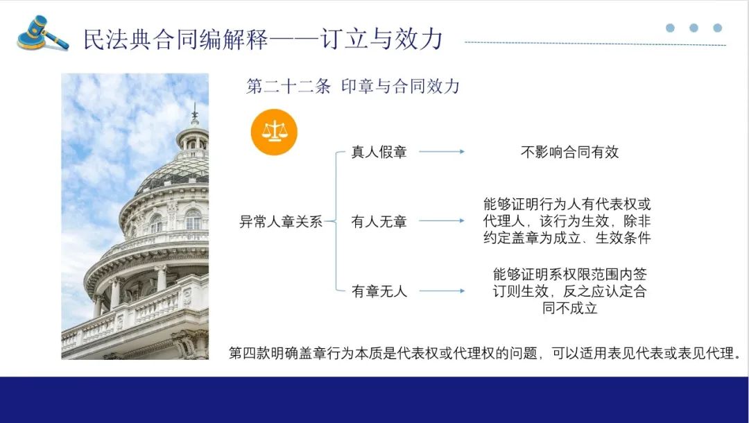 第22条规定的是印章与合同效力的规定,也就是实践中常说的“认人”还是“认章”。本次解释对几种异常的人章关系所作出的类型化规定:一是真人假章,即行为人有代表权或代理权,但加盖的印章并非备案印章,此时不影响合同有效。