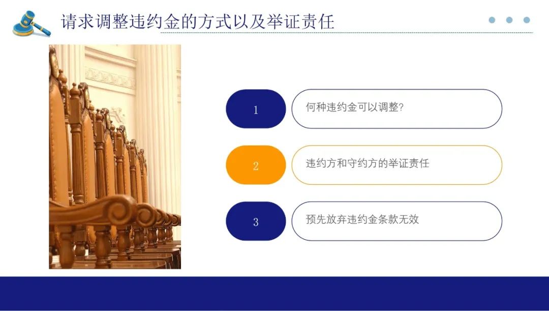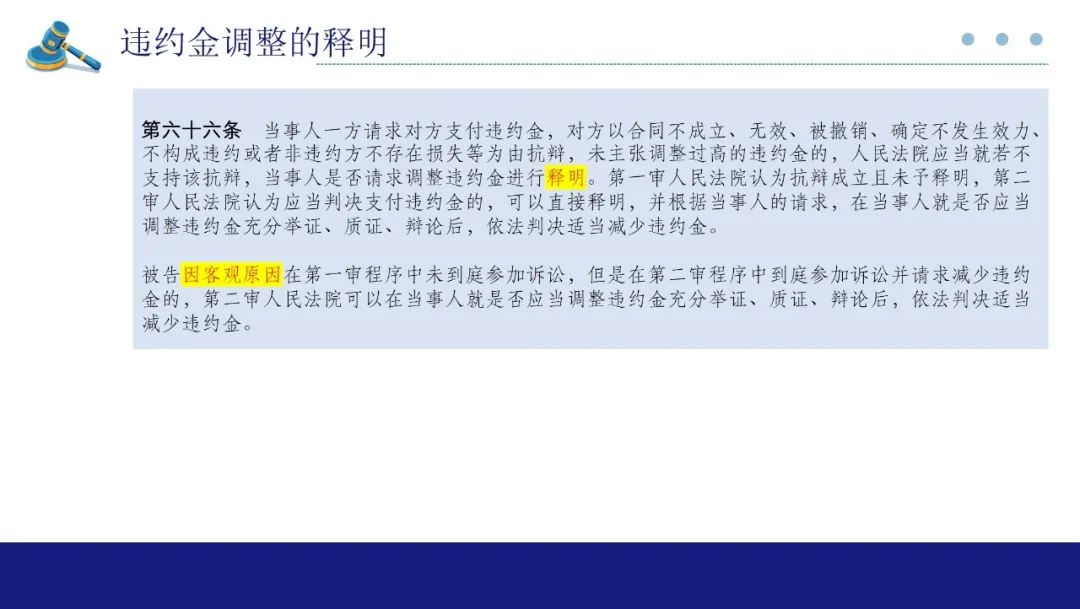 在双方提供证据后,若仍然处于真伪不明状态时,则由违约方承担举证不能的后果。该条款并非规定举证责任的转移,大家要注意作出区分。该条第三款明确请求调整违约金属于法定权利,不得通过约定的形式排除,这主要是为了防止强势一方利用其优势地位约定天价违约金,并排除另一方的请求调整权利,导致违反公平原则。