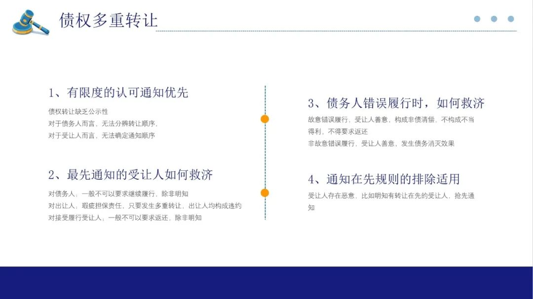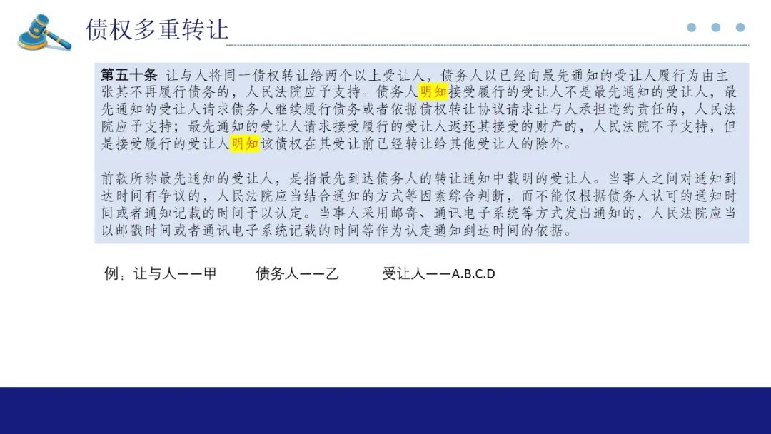 第50条,涉及债权的多重转让问题。从立法体例来看,我们是采用通知+明知的规则。通知即通知优先,在债权被多次转让的情况下,由于债务人无法分辨转让的顺序,故只能根据被通知的顺序确定清偿对象,这和民法典第546条规定未经受让人同意不得撤销通知的原理一致。