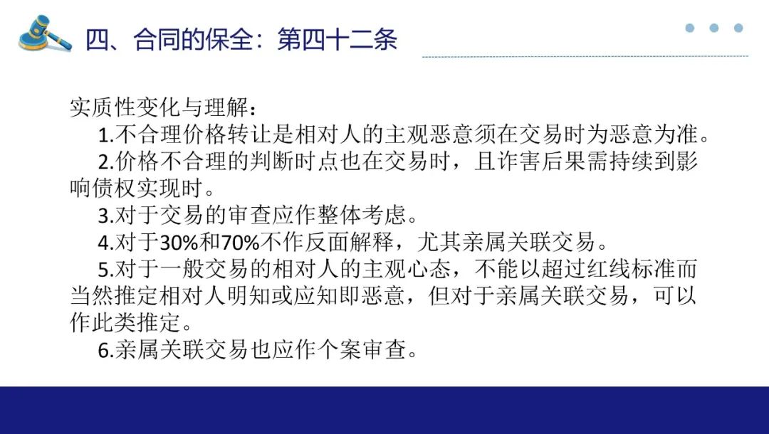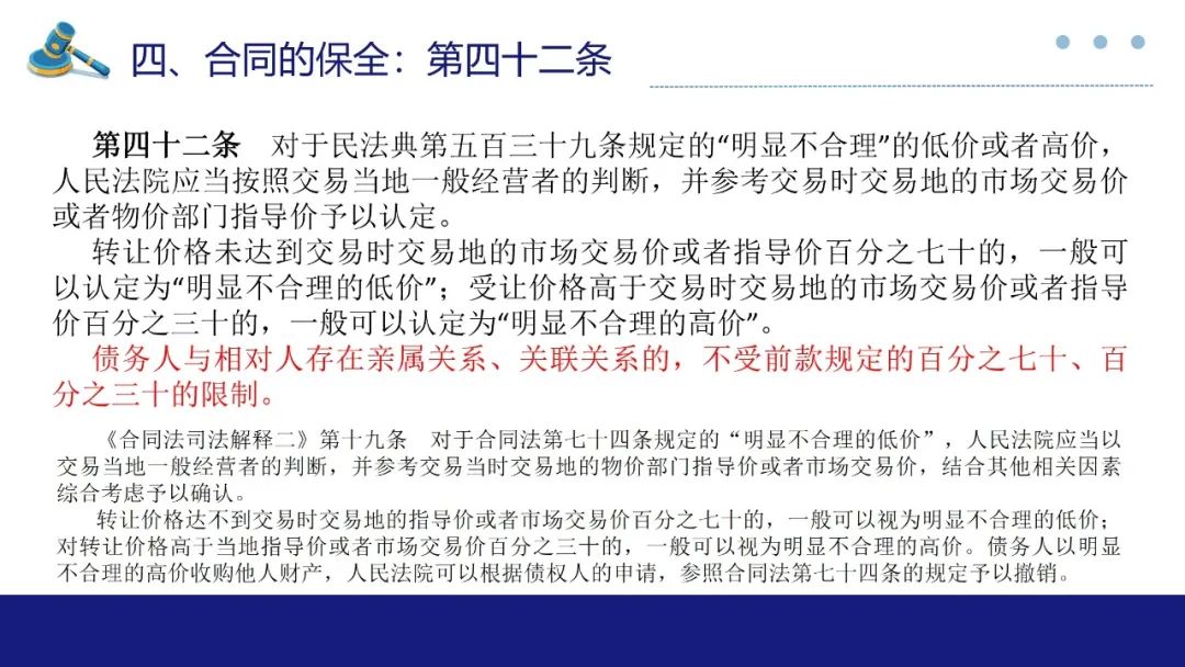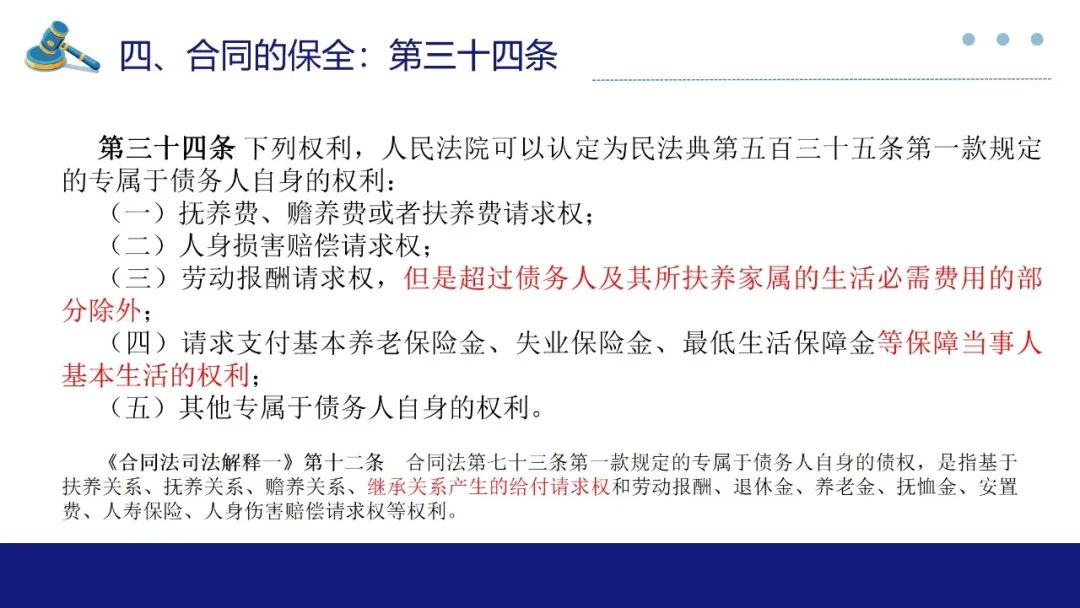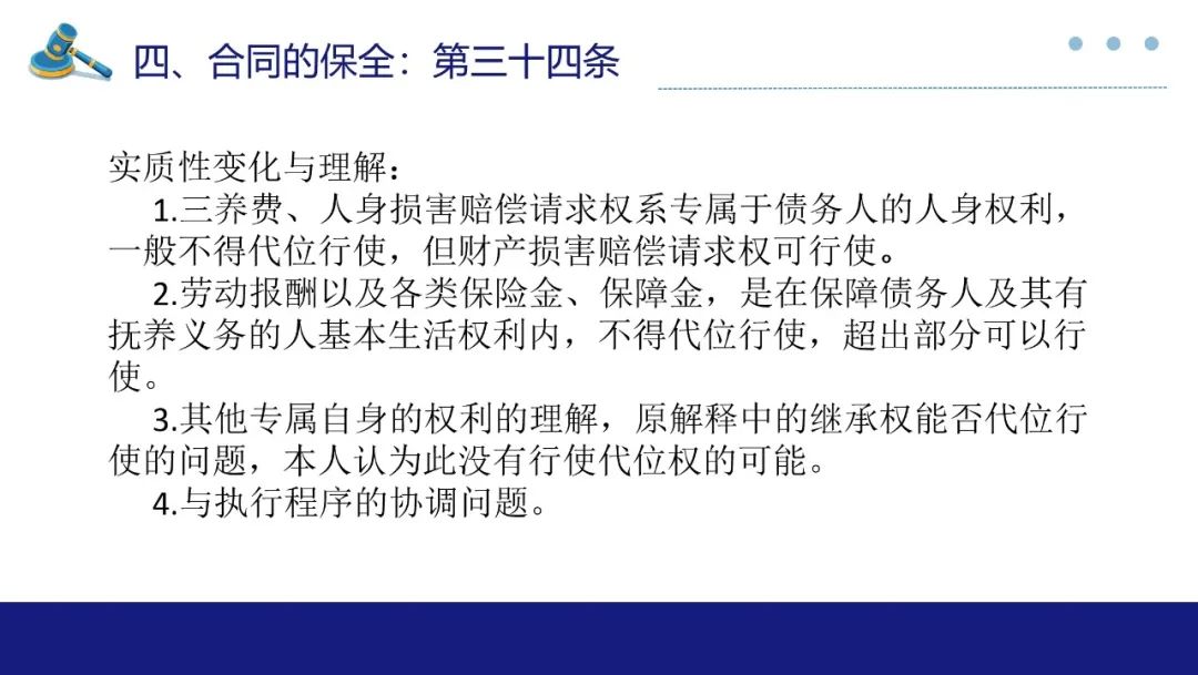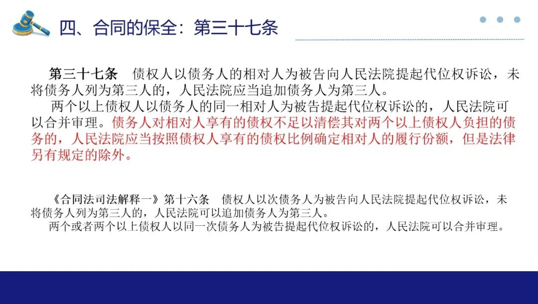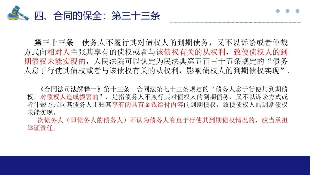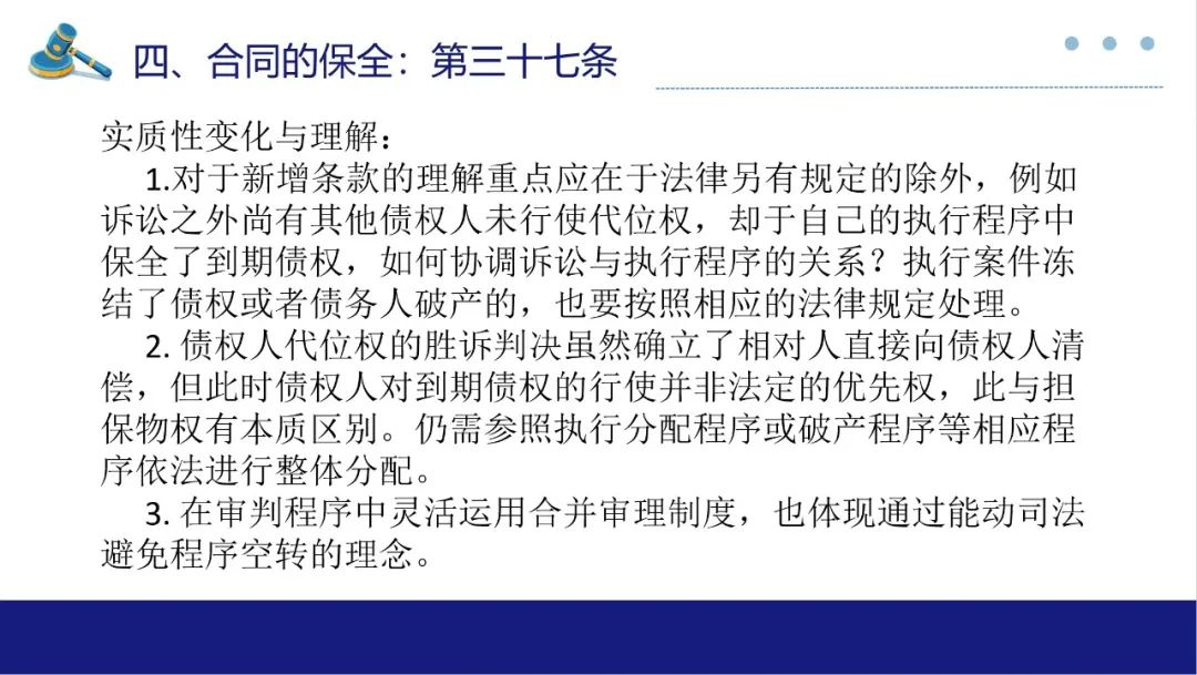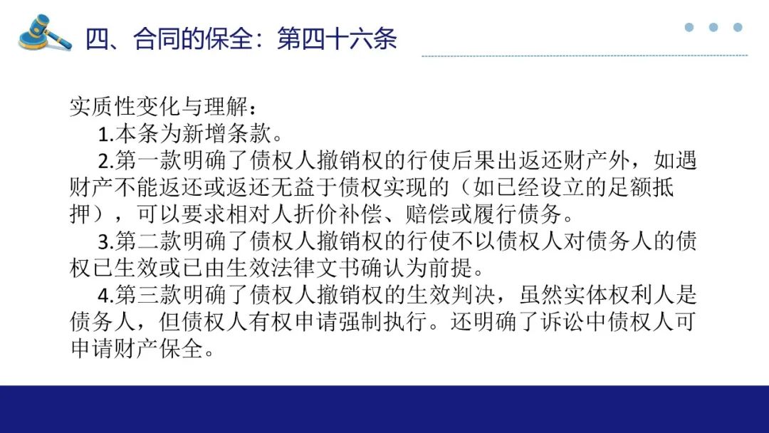 合同保全制度对于维护债权人利益,防止债务人不当减少财产以侵害债权人合法权益有着重要作用。此次最高法院《合同编通则解释》专设合同的保全一章,自第33条至第46条共计14条对于合同保全中债权人代位权与债权人撤销权两类诉讼作出较详尽的规范,本部分谈话围绕实质性变化与理解展开。